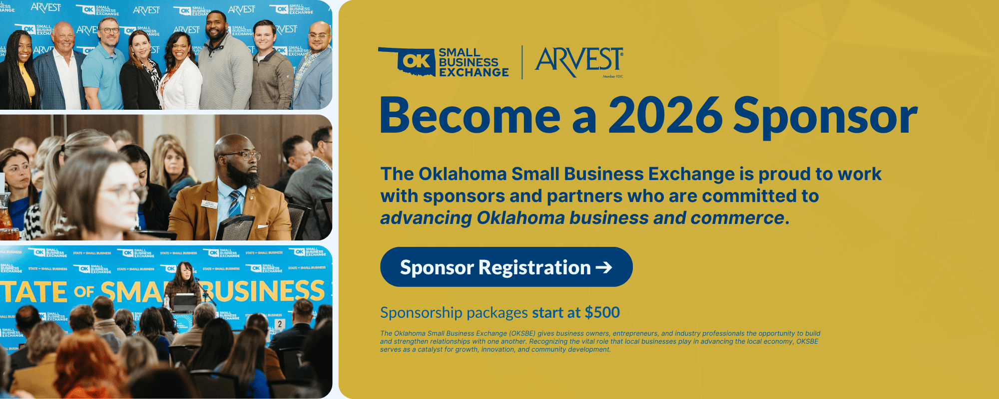 Sponsors are committed to advancing Oklahoma business and commerce through innovation, entrepreneurship, and thought leadership. Sponsors receive exclusive recognition before events, prominent visibility during events, and extended post-event visibility. Sponsorship packages start at $500.